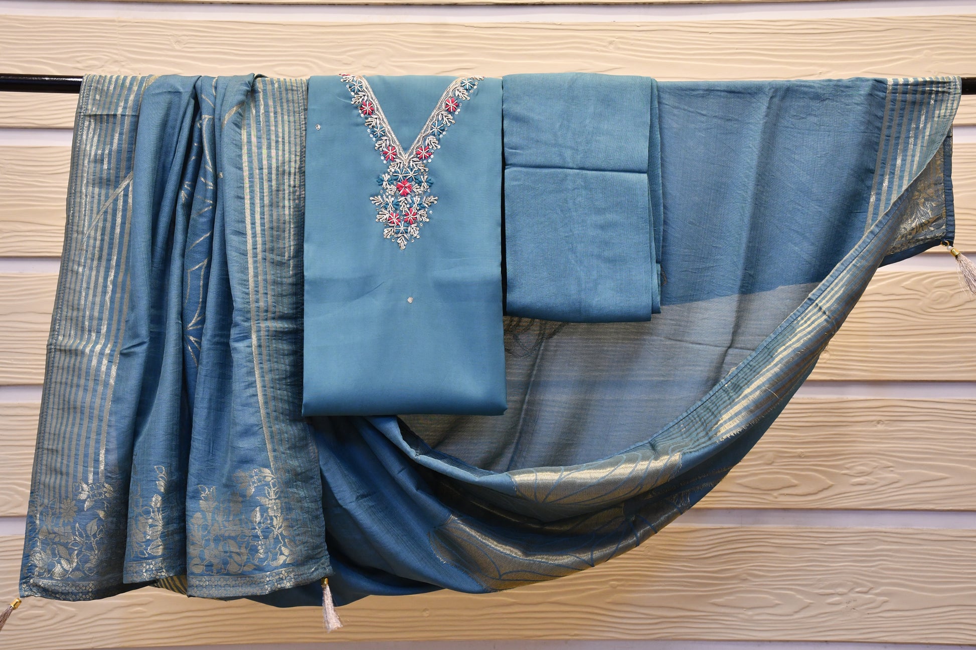 Elegant Art Silk Dress Material with V-Neck, Neckline Embroidery & Foil Work Flower Dupatta