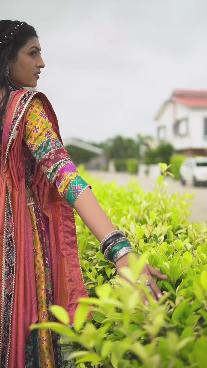 Step into luxury with this handcrafted Silk Patola Chanya Choli, a masterpiece of tradition and contemporary style. Designed with vibrant multi-color Patola silk panels, this outfit celebrates Gujarat’s rich weaving heritage while offering a unique, one-of-a-kind design that will never be repeated. The blouse features a modern cut with tie-back detailing, paired with a voluminous lehenga that flows gracefully with every step. Perfect for Navratri, weddings, and grand festive occasions, this exclusive piece from Siddhi Boutique is crafted for women who want to stand out in elegance.