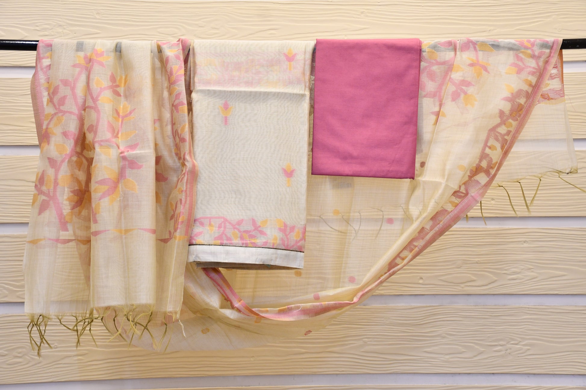Embrace timeless tradition with our Gadhwal Dress Material, featuring exquisite work details and paired with a stunning printed dupatta.