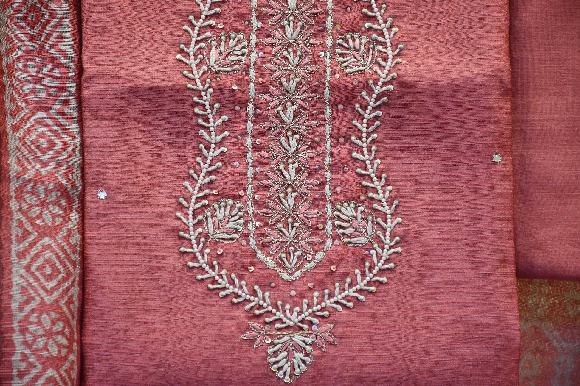 Embrace elegance with this raw silk dress material set, thoughtfully designed with delicate white pearl handwork around the neckline. The intricate detailing adds a subtle sparkle and timeless charm. It comes paired with a beautifully printed dupatta in matching tones, adding color and grace to the look. The coordinated raw silk bottom completes the set, making it perfect for festive occasions, intimate celebrations, or elegant day events.