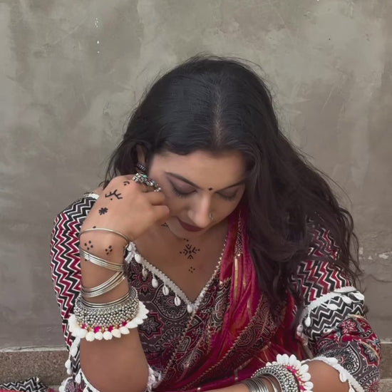 Work: Traditional Ajrakh embroidery, zari highlights, handcrafted tassel and bead detailing