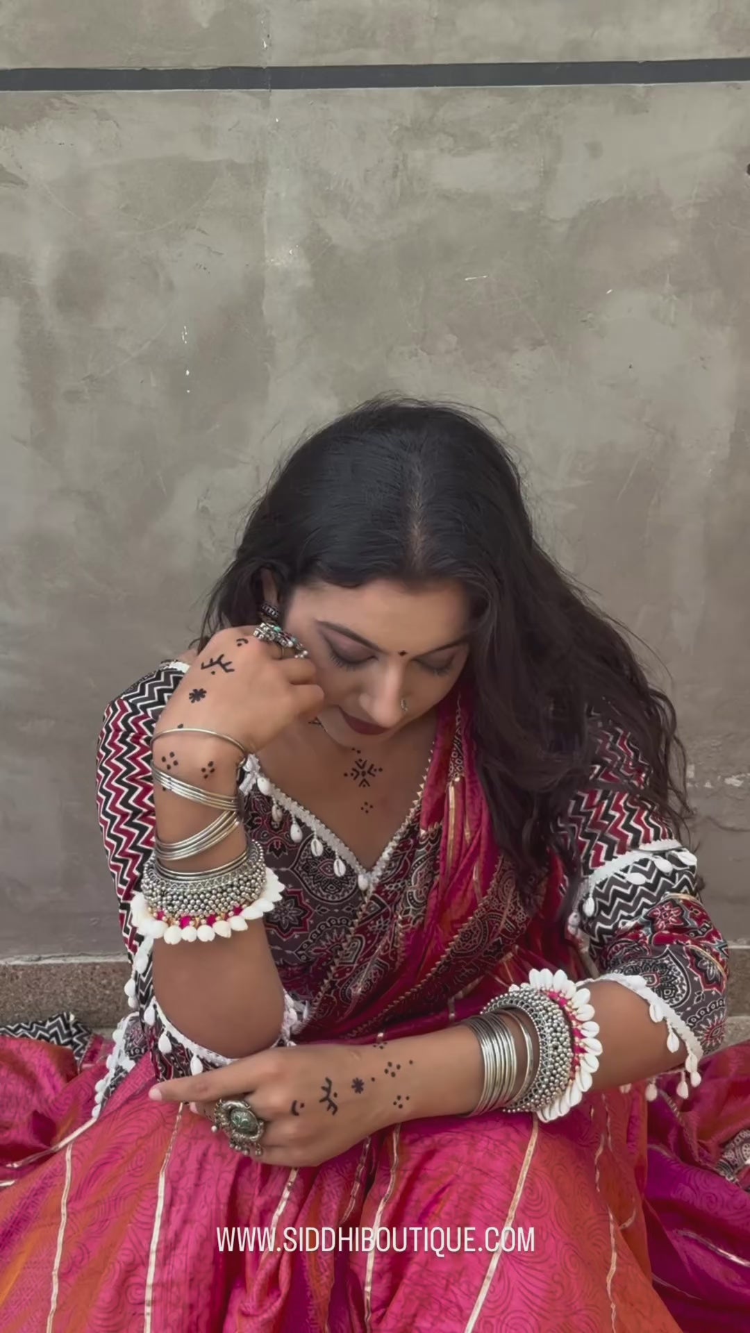 A true celebration of heritage and artistry, this Royal Pink Silk Chanya Choli blends traditional Ajrakh embroidery with the richness of silk. The lehenga, crafted in vibrant pink silk with golden zari lines, is highlighted with Ajrakh-printed panels and a statement embroidered waist patch finished with dainty tassels. The blouse is intricately hand-embroidered with Ajrakh motifs and mirror-inspired designs, adorned with white bead lace for a festive touch. The dupatta completes the look with Ajrakh borders and zari detailing, making this ensemble perfect for grand occasions.