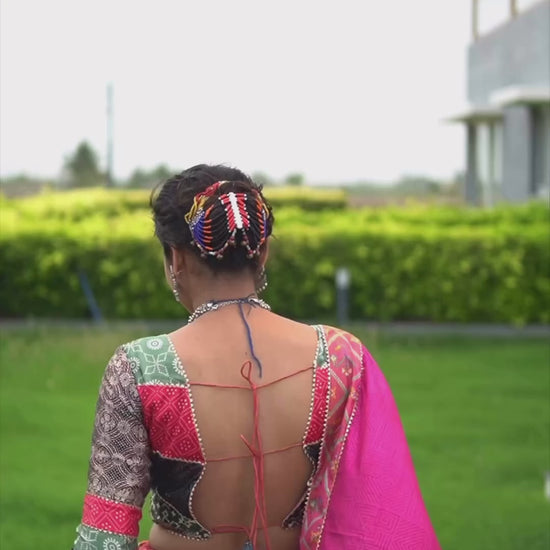 A vibrant fusion of elegance and heritage, this Pink Silk Patola Patchwork Chanya Choli is designed to make you stand out in every celebration. The lehenga features striking Patola silk panels along the border, highlighted with handcrafted tassels for a festive flair. The blouse is designed with a flattering cross-panel patchwork pattern and a modern tie-back style that adds both comfort and sophistication. Finished with intricate detailing, this exclusive piece embodies the spirit of traditional weaving with a contemporary twist.