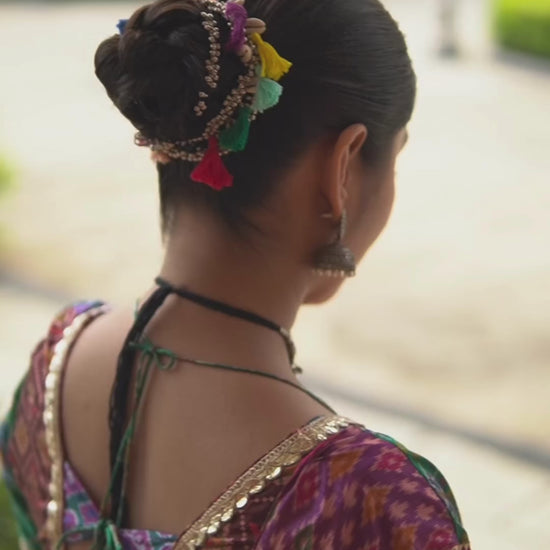 Celebrate colors, culture, and craftsmanship with this Vibrant Multicolor Silk Patola Chanya Choli. The lehenga is designed with alternating Patola silk panels in rich shades of green, red, purple, and gold, creating a bold festive look that is truly one-of-one. The blouse features a unique scallop neckline with delicate lace edging and a stunning criss-cross tie-back design that ensures both comfort and style. Perfect for Navratri nights, weddings, and grand festivities, this exclusive Siddhi Boutique creation guarantees you’ll stand out from the crowd.